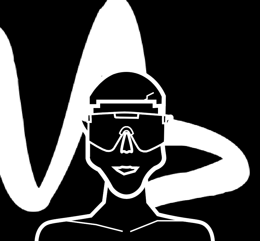 Black and white digital illustration of a woman wearing goggles with her hand behind her head, and abstract shapes in the background.