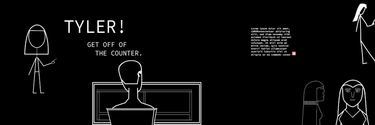Line art illustration of a person sitting at a computer with the words "Tyler! Get off of the counter." Swirling characters and a paragraph of placeholder text are in the background.